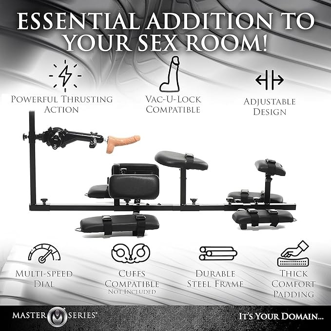 MASTER SERIES Subversion Deluxe Stockade with Sex Machine for Men, Women, & Couples. Durable Steel Frame, Padded Comfort, Multi-Speed Sex Machine. BDSM Furniture. 7 Piece Set, Black.